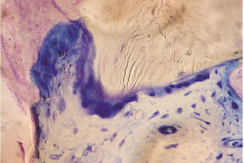 After nine months, histological analysis showed highly mineralized and well-organized new bone (Fig. 1) with dense osteoid matrix, mainly located in the coronal portion (Fig. 2). Geistlich Bio-Oss® remnants were perfectly osseointegrated and surrounded by marrow spaces populated by numerous blood vessels without inflammatory infiltrates (Fig. 3). Many fronts of bone remodelling rich in osteoblasts depositing new matrix (Fig. 4) and osteoclasts in a resorption lacuna (Fig. 5) confirmed the vitality of the regenerated bone.